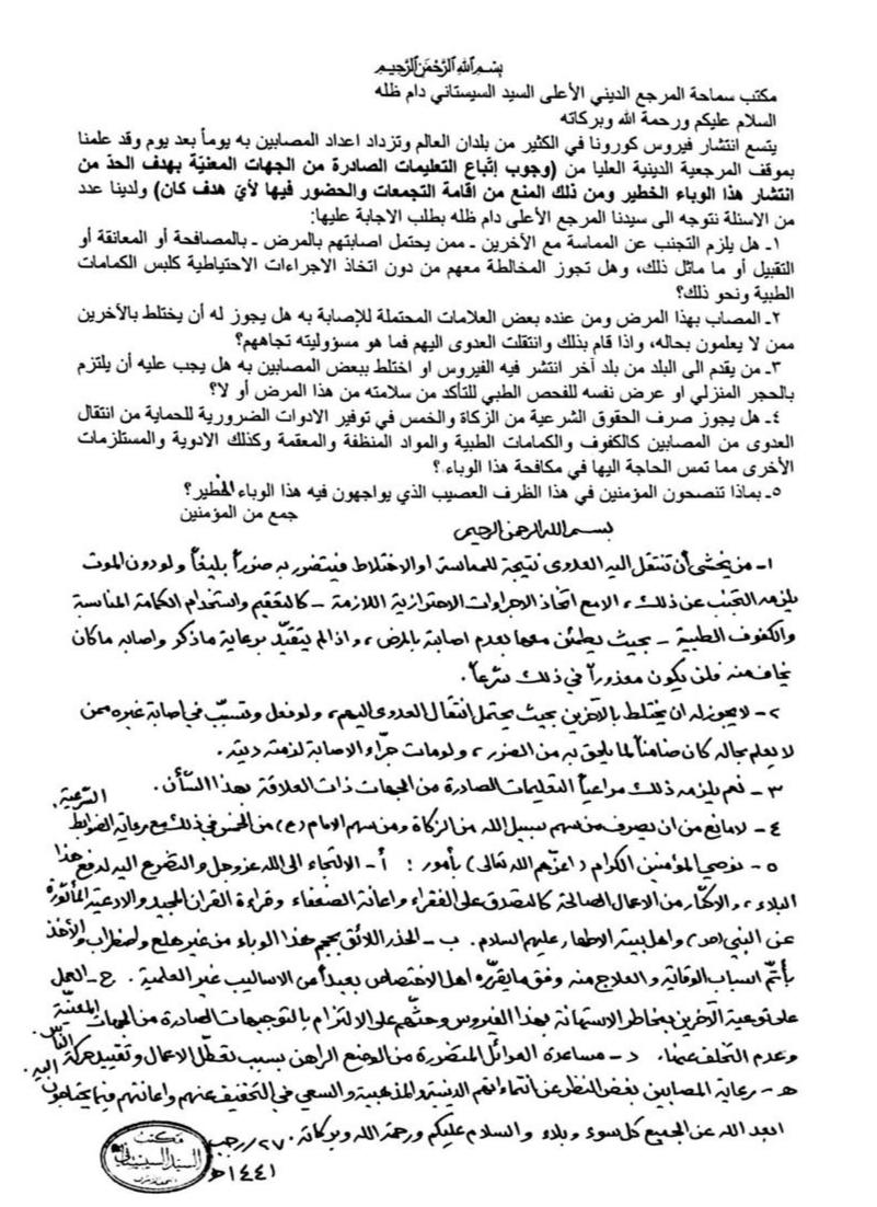 استفتاء صادر عن مكتب المرجع الأعلى السيد السيستاني دام ظله، حول الفايروس المستجد