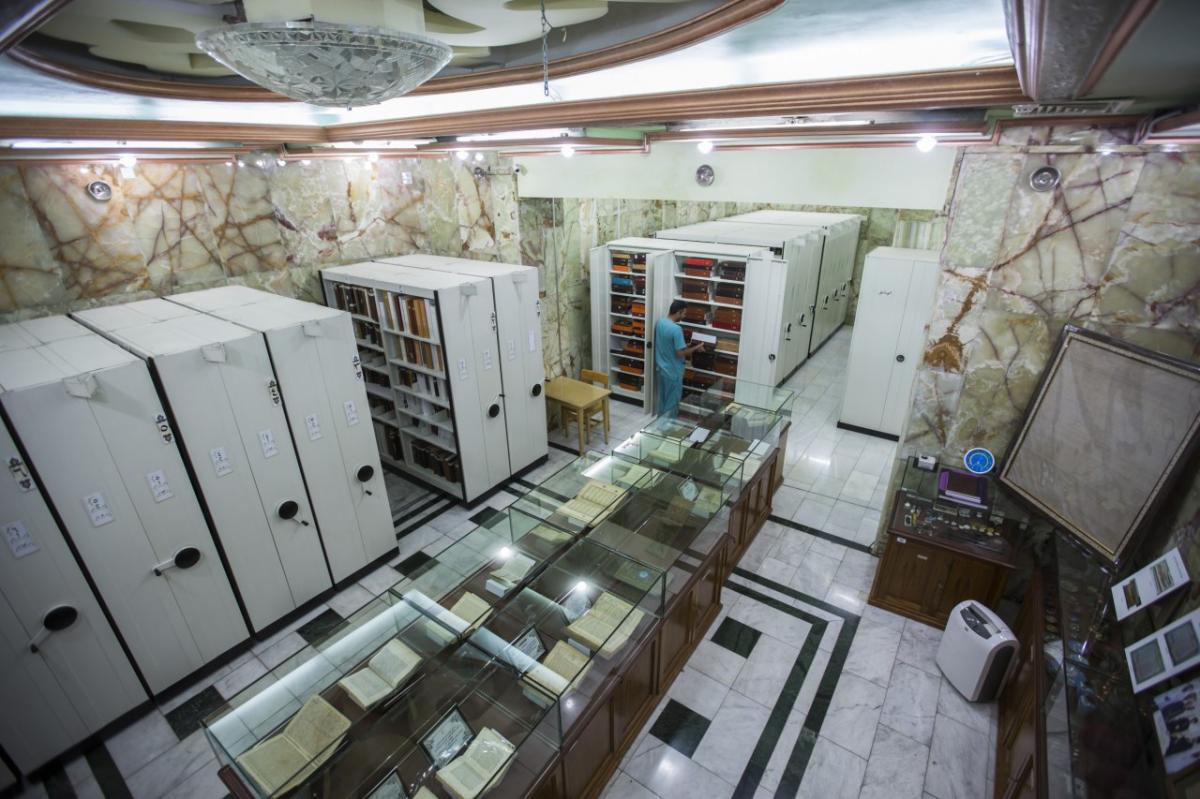 وأضافت: "الخزانةُ عبارة عن قاعةٍ حصينة أُنشِئت بمواصفاتٍ فنّية خاصّة جدّاً، مزوّدة بعددٍ من الخزانات المعدنيّة الموزّعة حسب استخدامها للمخطوطة أو الوثيقة، وهذه الغرفة مزوّدة بأجهزةٍ ومعدّات تعمل على المحافظة على هذه المقتنيات الأثريّة، حيث تعمل على توفير بيئةٍ للخَزْن من ناحية درجات الحرارة والرطوبة المناسبة، وغيرها من الأمور التي تسهم في خلق أجواءٍ مثاليّة للحفظ، وفق المعايير الدوليّة من درجة الحرارة وهي 18 – 20 درجة مئويّة، والرطوبة بمعدل 45 - 55%، وكذلك زوّدت هذه الغرفة بمستشعرات حراريّة وأجهزة مرتبطة بمنظوماتٍ للسيطرة على الحرائق".