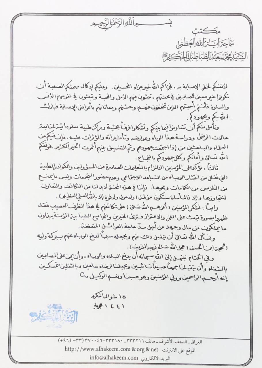- وجه -المرجع الديني الكبير سماحة آية الله العظمى السيد محمد سعيد الحكيم (دام ظله) - دعوته الى المرضى المتعافين من جائحة فايروس كورونا من خلال التبرع ب(بلازما النقاهة) من أجل تخفيف معاناة المصابين وتقليل الضحايا منهم وأكد سماحته أن هذا فيه أعظم الأجر والثواب كونهم يكونوا شركاء