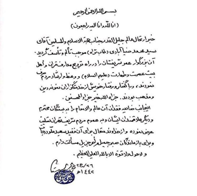 آية الله السيد محمد ضياء ابادي من الاساتذة والعارفين وكان مثالا للتقوى والاخلاق وقد تربى على يده كثير من العلماء الافاضل وله مجالس ضخمة في الاخلاق والتفسير وله مؤلفات كثيرة وقيمة منها تفسير سورة القيامة وهو من روائع كتبه رحمك الله ايها الاستاذ المعظم